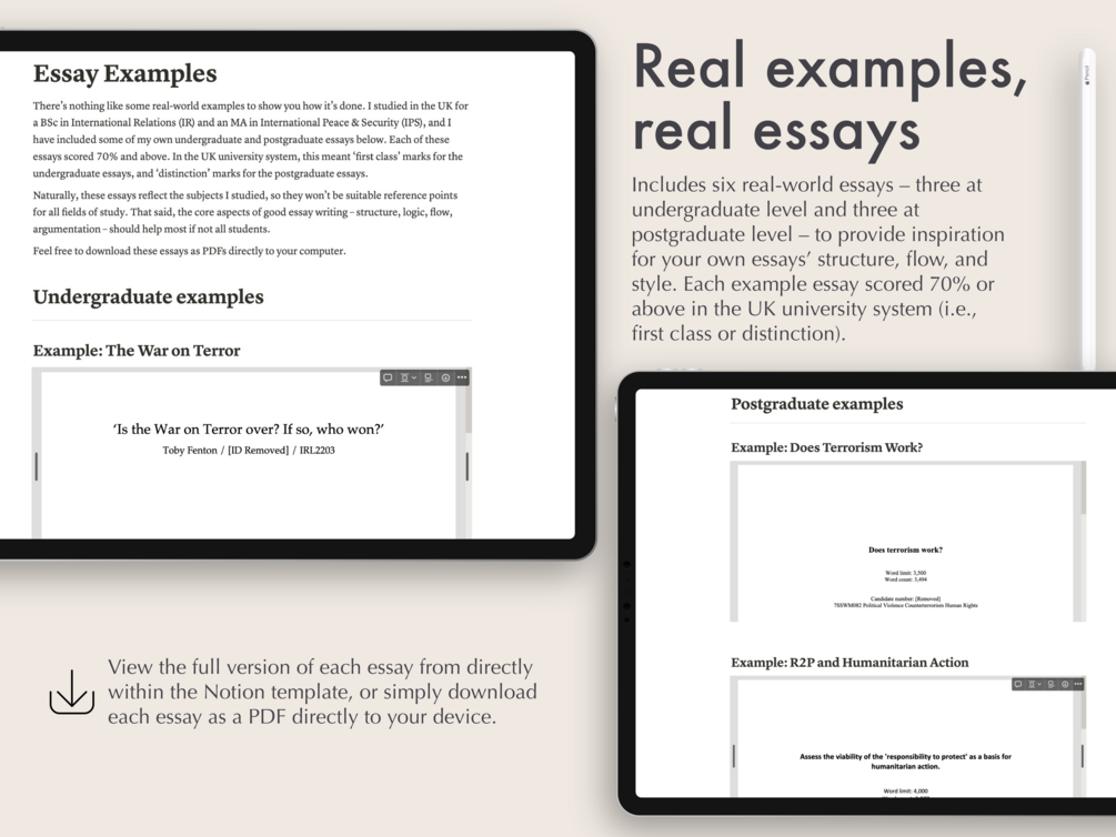 — 6x full essay examples (3x undergraduate and 3x postgraduate) from international relations courses, all of which received 70%+ marks (which means first class at undergraduate level and distinction at postgraduate level), so you can get inspiration for what real-world top-mark essays look like.