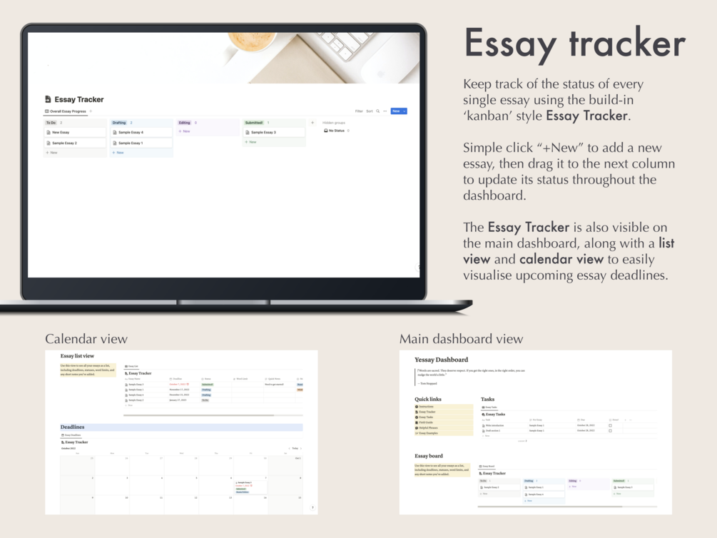 A clean, customisable template for Notion that helps students plan, writer, track, and improve their essays.
