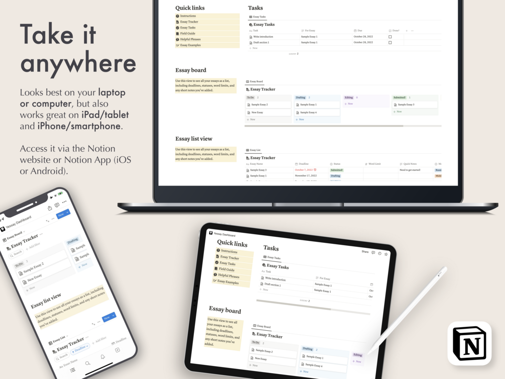 — The Notion template is designed for your laptop/computer, but also works great on your iPad/table and iPhone.